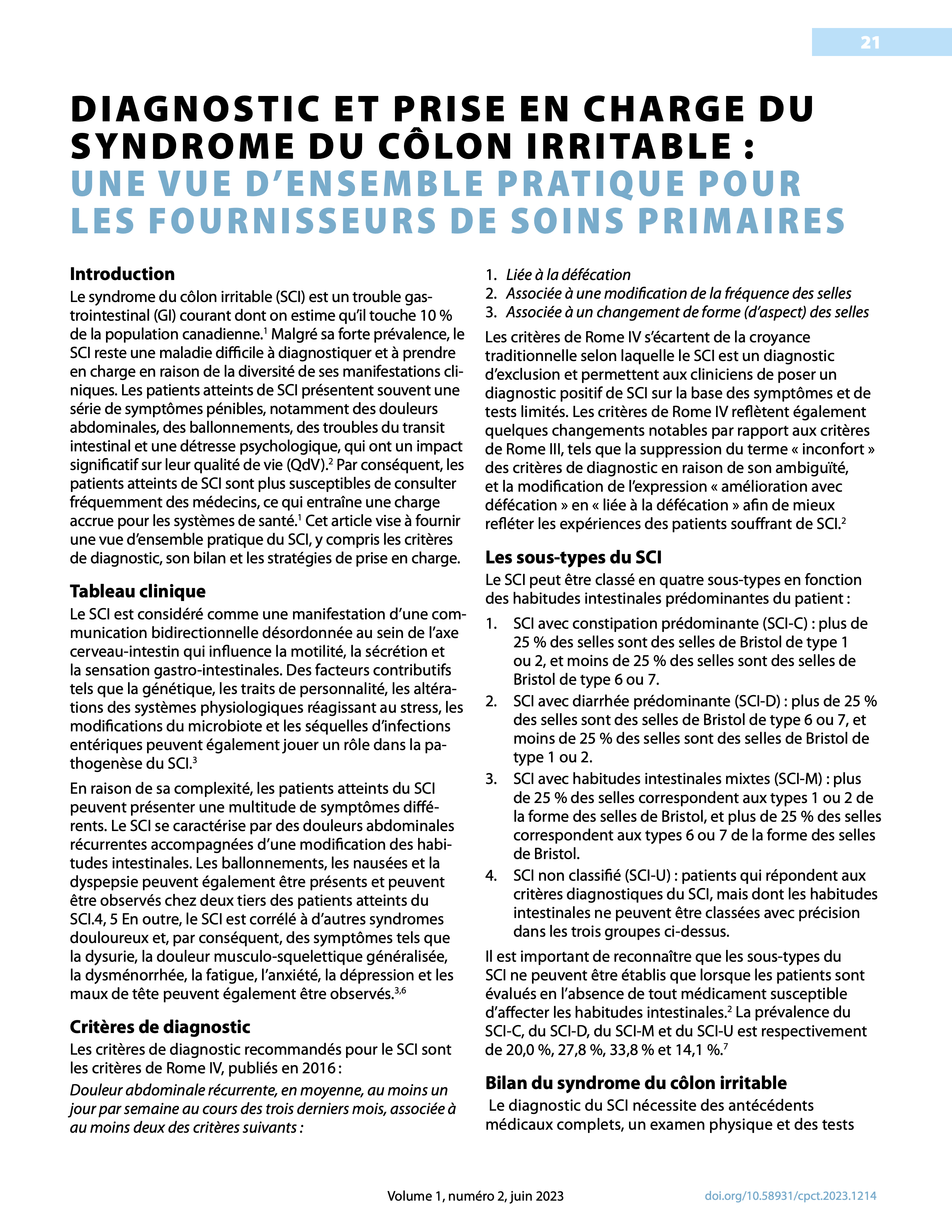 Diagnostic et prise en charge du syndrome du côlon irritable: Une vue d’ensemble pratique pour les fournisseurs de soins primaires. Can Prim Care Today [Internet]. 4 juill. 2023 [cité 7 avr. 2026];1(2):18–22. Disponible à: https://canadianprimarycaretoday.com/article/view/1-2-guo_et_al